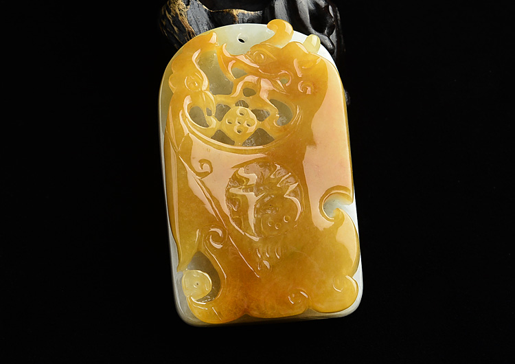 (超值推荐)糯冰种黄翡略飘花仿古龙凤牌挂件