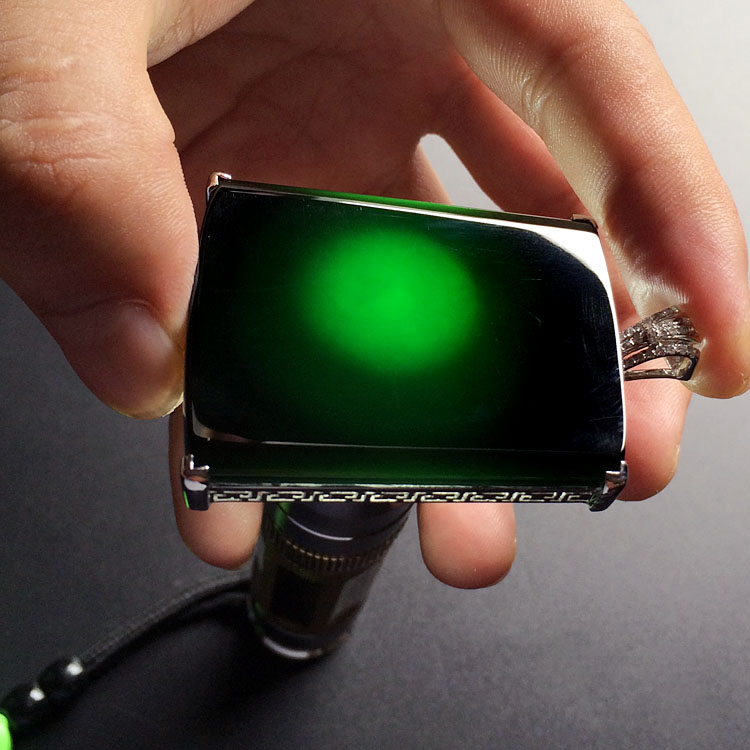 肉眼观测: 结构细腻致密,粒度均匀,10倍放大镜下不见粒度及复合原生、次生矿物充填痕隙,偶见翠性。 细微的内、外特征,肉眼较难见,对整体美观几乎无影响。