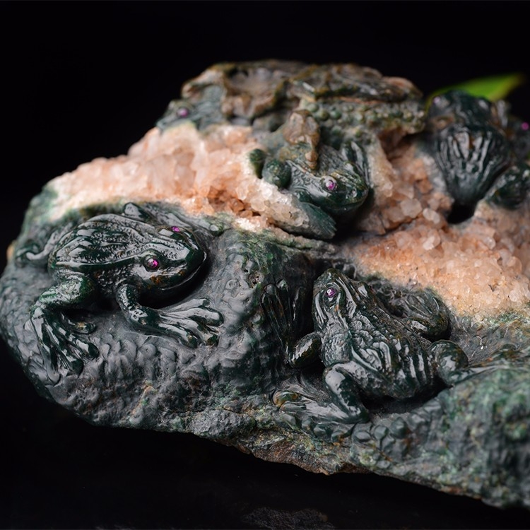 描 述:阿拉善玛瑙(学名石英岩玉)摆件——呱呱来财。质地凝润,色泽醇厚,玉质肌理独特,保留天然伴生水晶,质朴而大气,粗糙质朴反而凸显了青蛙的造型和趣味性。青蛙眼睛采用红宝镶嵌,亮眼独特。作品立意明确,细节处理细致,艺术感十足;“青蛙“呱呱”叫,叫声响亮,四面八方都能听到,因此青蛙也有四通八达、八方来财的寓意;肉眼可见避纹美化雕琢,不影响整体美观。提供玉雕界民间巧匠收藏证书。
