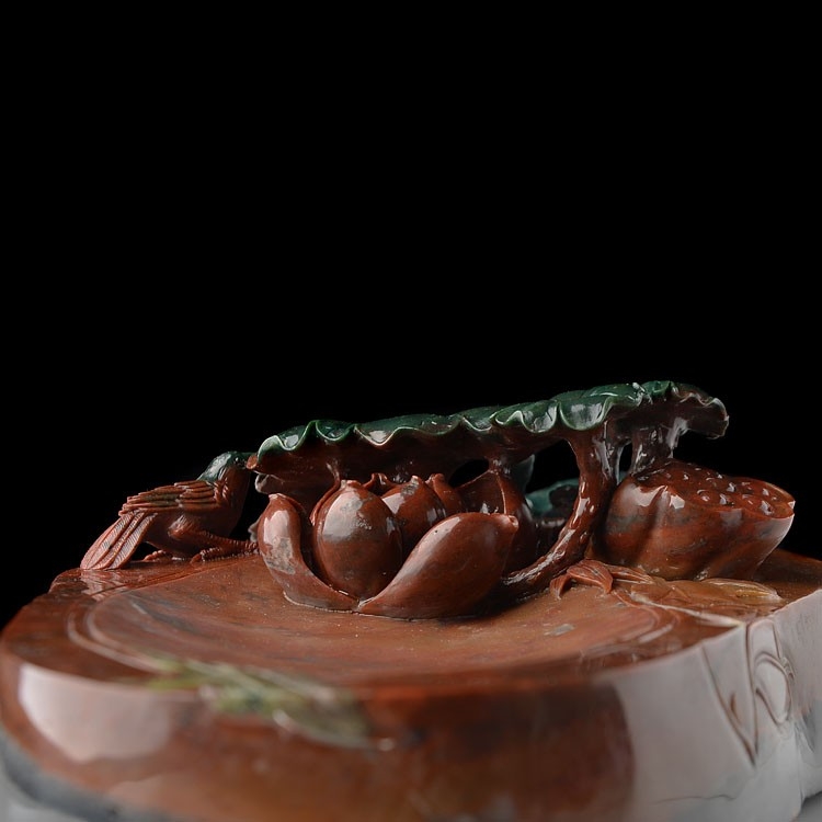 描 述:喜事连连。莲与“连”谐音,可以与其他吉祥的事物组合在一起表达出很多吉祥的寓意,作品雕刻莲叶、莲花、莲蓬,从叶到果,从无到有,寓示了有志者事竟成,一只喜鹊翘首望莲,更是寓意喜事连连;印度七彩玛瑙砚台/摆件,玉质温润,色泽浓郁醇厚,俏色巧雕,雕工精细灵动,栩栩如生,有石纹及天然矿缺,但瑕不掩瑜;玉雕界签约玉雕名家陈金水作品,提供亲笔签名收藏证书。
