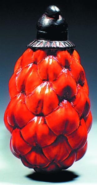 植物类烟壶千奇百怪,从选材上:木刻、根雕、竹木、果核、葫芦、松塔、漆器等应有尽有。此类烟壶贵在自然天成。