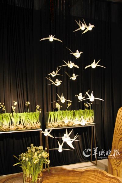 让我们一一来看这些会说话的家具吧,酒瓶造型的一串灯悬挂于屋顶,玻璃瓶身巧配上木质瓶嘴,暗黄温暖的灯泡置于其中,最称奇的是将高雅恬淡的水仙插入瓶中,绽放的水仙斜着探出它的头,片片舒展开的花瓣仿佛是在招呼来客,让人有“乱花渐欲迷人眼”的恍惚。同样是灯具,鸟灯和瓜灯也颇值得参观者驻足和留心观赏。鸟形灯呈白色,也是成串地悬挂,但朝向和形态各不同,翅膀张着做飞翔状,像是早春的清晨,一群鸟儿在林间嬉戏。如果说鸟形灯诠释了大自然的清新和动态,那么瓜灯则给人敦实和憨厚的感觉。更多的瓜的造型器皿被摆放在桌子上,外观形态更为多样,或高或低,亏得设计上对曲线有着足够的考究,使得瓜形设计系列平添了几分可爱。