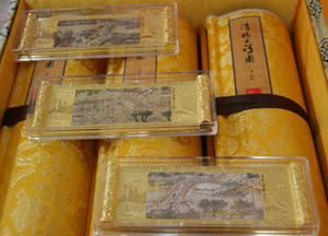 与世博金轴《富春山居图》同时推出的还有世博金轴《清明上河图》。诞生于宋代的《清明上河图》被誉为“中华第一神品”,是中国十大传世名画之一,属国宝级文物。由上海世博局授权、国金黄金集团推出的金轴《清明上河图》,以独特而精美的造型,丰富的设计内涵,珍贵的纯黄金材质,全面地展现了宋、明、清三版传世国宝。