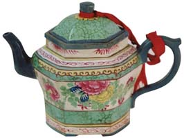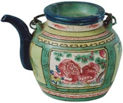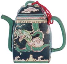 乾隆黑云龙大汉方壶(图4)。通高18.6厘米,接近正方形略扁。全壶用上等紫砂制成,除底部外满彩。主要黑釉,使五彩云龙更显得鲜明夺目。巨龙四爪,怒目张口,十分凶猛。龙头和前肢等在壶的一面,龙尾和后肢等在壶的另一面,整条龙穿壶而过,更显得巨大和生动。这种“穿墙龙”的画法,创自雍正时期,乾隆时盛极一时。底款“澹然斋制”为乾隆时常见款识。