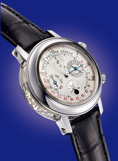 功能是机械表作为一门科学的直接反映,在名表发展历史上出现了不计其数的各类功能,而且创新的思维从一开始就没有停止过。在有限的空间中,将时间的计量从微观变成宏观,将时间的感知从视觉变成听觉,都是由各种复杂功能来实现的。例如体现日历、星期、月份、闰年等历法的万年历功能,还有通过声响报告时、刻、分的打簧报时功能,甚至是最初希望抵抗地心引力后来却成为彰显制表工艺的陀飞轮等等,都是制表师的聪明智慧的体现,也是名表几个世纪以来立于不败之地的根本。百达翡丽的3939型号手表就是一个最明显的例子。它在安帝古伦2011年10月份香港拍卖会上占据了成交价榜眼之位。这款融合陀飞轮与三问报时功能的作品,在制表领域当属超级复杂功能的表款,作为本场最后压轴的拍品,以362万港币成交。巧合的是,早在本场拍卖会的一个月前,同样型号但材料不同(钢款)的表款却以140万欧元的价格成交,居然比铂金款成交价高出4倍,估计是年度最具话题性的钟表拍品了。