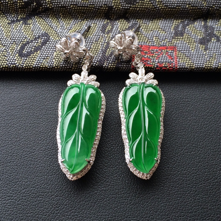 (超值推荐)冰种阳绿镶白金钻石玉叶耳坠一对