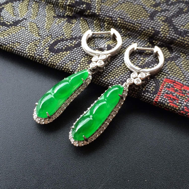 (超值推荐)冰种阳绿镶白金钻石四季豆耳坠一对