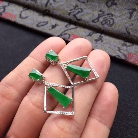 (超值推荐)冰种翠绿镶白金钻石平安牌耳坠一对