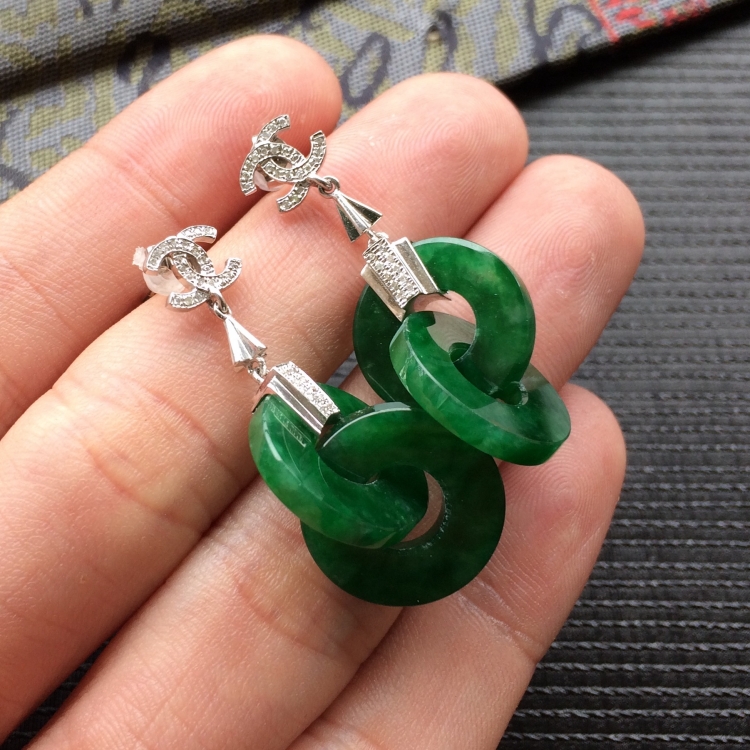 (超值推荐)糯冰种浓绿镶白金钻石平安环耳坠一对